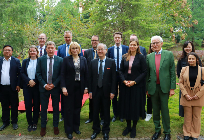 在中德友誼林,卡塔琳娜·普特市長與校領(lǐng)導(dǎo)手握鐵鍬,合力為這株象征中德友誼的松柏培土、澆水。植樹活動完成后,雙方握手并合影留念。