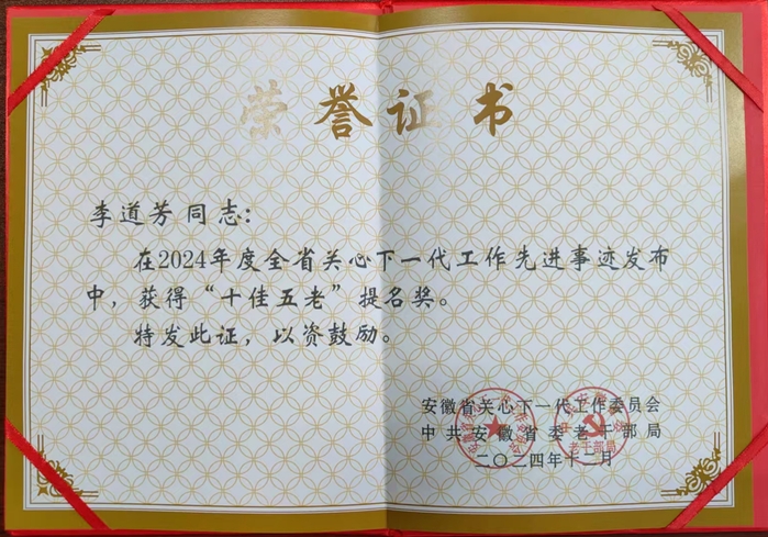 2月28日下午,合肥市關工委2025年度工作會議在市政務中心召開。會上開展了合肥市關心下一代工作“雙十佳兩示范”(雙十佳:十佳工作集體、十佳“五老”;兩示范:示范“五老”工作室、示范工作品牌)命名工作,我校關工委榮獲“十佳先進集體”。此外,在2024年度全省關心下一代工作“十佳五老”先進事跡發布活動中,李道芳教授榮獲提名獎。
