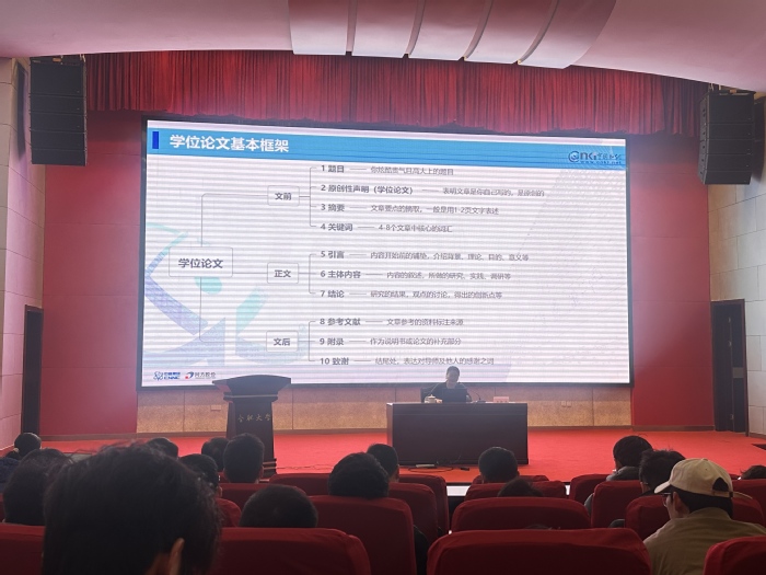 研究生處副處長高大明在致辭中表示,活動旨在增強校園學術氛圍,提升我校研究生的學術素養和科研能力。首場講座上,知網工程師王銀杏以《知網AI與DeepSeek協同——重構學術創新生態》為題展開深度分享。報告內容圍繞學術論文寫作的體系化建構、AI技術驅動的科研新生態、知網資源的高效利用策略逐一展開,重點從科研論文選題的精準定位切入,強調“問題意識”是學術創新的起點,并演示了知網AI與DeepSeek技術的協同應用場景和系統梳理知網總庫的分類檢索技巧。在互動環節,與會師生就算法透明度、學科特異性模型開發等議題展開熱烈討論。