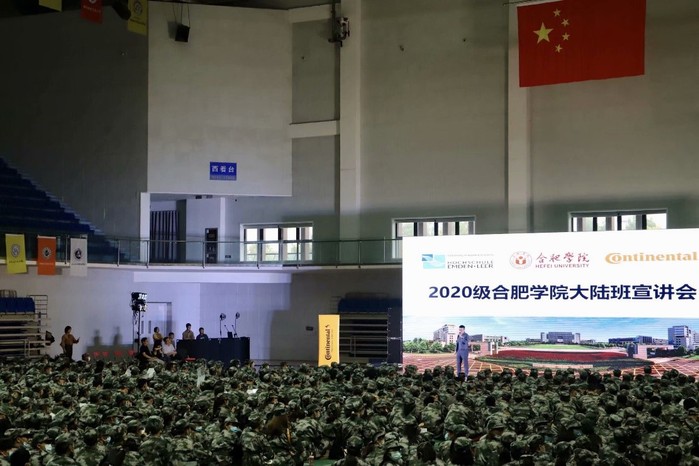 首先,他代表校方對(duì)合肥學(xué)院2020級(jí)新生致以誠(chéng)摯的歡迎和祝福,并詳細(xì)介紹了這個(gè)由合肥學(xué)院、德國(guó)埃姆登里爾應(yīng)用科學(xué)大學(xué)和大陸集團(tuán)三方合作辦學(xué)的項(xiàng)目,闡明了大陸班的辦學(xué)理念和入學(xué)要求。他表示,無(wú)論是合肥學(xué)院校方還是德國(guó)高校和公司都對(duì)大陸班寄予了厚望,希望有能力和追求的同學(xué)加入大陸班,成為揮灑青春、一起拼搏的一員。