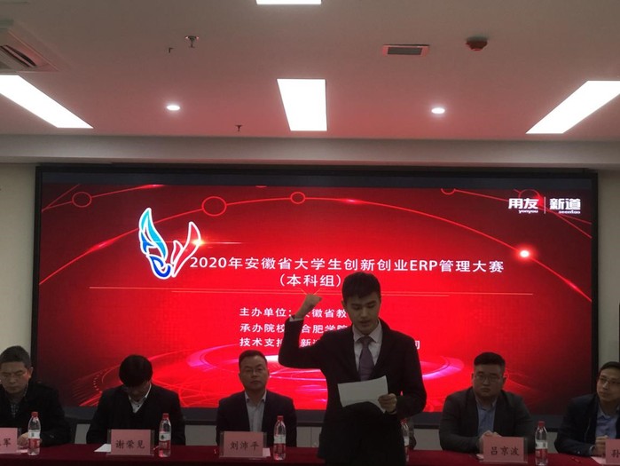 11月7日,由安徽省教育廳主辦,合肥學院承辦的2020年安徽省大學生創新創業ERP管理大賽在我校舉辦。安徽省大學生創新創業教育辦公室主任、合肥學院大學生創新創業教育中心主任劉沛平,合肥學院經濟與管理學院黨總支書記楊學春、副書記張永軍,安徽工程大學經濟管理學院院長謝榮見,新道科技股份有限公司安徽區總經理呂京波等出席大賽開幕式,開幕式由大學生創新創業教育中心副主任孫虹主持。