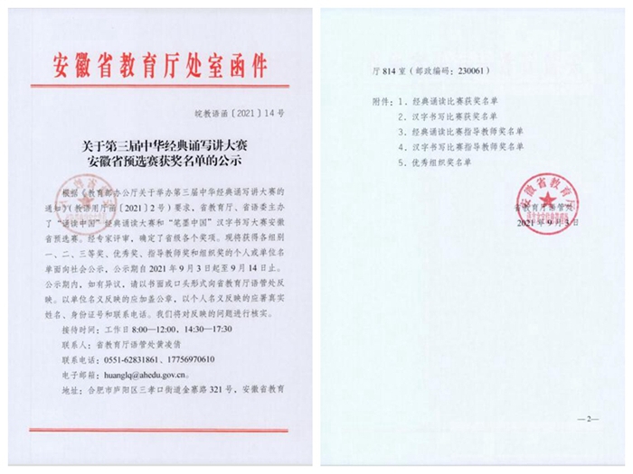 為弘揚中華優秀語言文化,歌頌建黨百年光輝歷程,教育部舉辦第三屆中華經典誦寫講大賽,安徽省教育廳舉辦了安徽省預選賽。我校師生積極參賽,在朗讀和漢字書寫比賽中取得了優異的成績,我校獲得安徽省預選賽優秀組織獎。