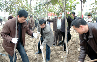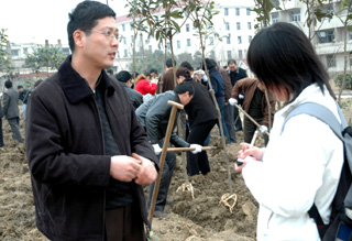 北區院直機關黨員按通知下午2∶30從北區出發,可下午2∶00時,專車周圍就圍滿了人,每個人臉上都溢滿了興奮和期待,尤其搶眼的是那些女士們,一改平日的嚴謹、文靜,開心地歡笑著,欣賞彼此難得一見的“奇裝異服”,以及彼此各具魅力的神采。這時只聽人群中一個響亮的聲音:“我是第二次參加南艷湖植樹活動。院直機關黨總支組織這樣的活動,好啊!讓我們有機會為‘整治四亂、美化校園’盡自己一份力。”循聲一看,原來是紀委吳老師正在熱情地演說,吳老師可是一身的干練,球鞋、手套、運動帽,全副武裝。這時我看見了吳老師身邊一身儒雅之氣的院直機關黨總支書記、組織部部長劉建中,趕緊擠上前去采訪,劉書記說:“這種活動是我院一個傳統節目,開展這樣的活動有利于加強黨組織的凝聚力,強化黨員意識,是保持共產黨員先進性教育實踐活動的延續,是機關加強效能建設,增強服務意識,轉變工作作風的表現,也是機關黨員愉悅身心,腦體結合的很好方式”。