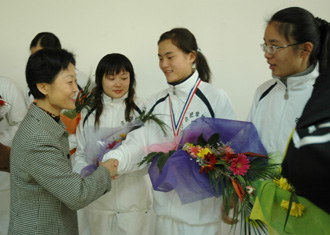 (院新聞中心記者/孫宏婷)15日上午10時許,在我院南區(qū)主樓二樓會議室,鮮花和笑聲襯托著祥和的氣氛,合肥市人民政府副市長張雪平、市體育局局長汪杰親臨我院親切看望和慰問我院剛剛參加第十一屆全國大學(xué)生擊劍錦標(biāo)賽凱旋歸來的擊劍健兒們,院長趙良慶和基礎(chǔ)教學(xué)部、宣傳部、院辦、學(xué)生處、團(tuán)委等有關(guān)部門負(fù)責(zé)人出席,新華社安徽分社、《安徽日報》、《新安晚報》、《合肥晚報》、《安徽青年報》以及省市電視臺等眾多媒體參加。