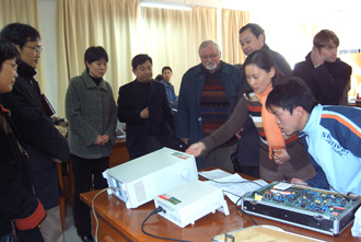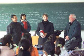 德國(guó)客人一行還參觀了我院教學(xué)主樓及機(jī)房、實(shí)驗(yàn)室等教學(xué)資源。Heinz-Guenter Luck先生參觀后說,貴院的規(guī)模很大,教學(xué)設(shè)備也相當(dāng)齊全。他們還饒有興趣地來到外國(guó)語言文學(xué)系2003級(jí)英語本科的課堂上,與正在學(xué)習(xí)德語的學(xué)生和教師進(jìn)行互動(dòng)交流。