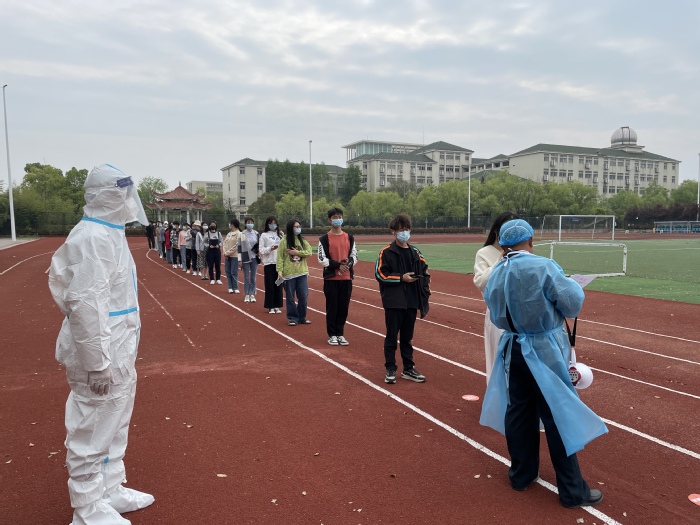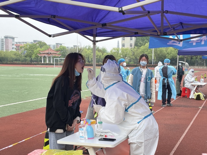 13點,演練正式啟動。參加演練的學生佩戴口罩、間隔一米、測量體溫,持健康碼、行程碼登記信息,有序進入核酸采樣檢測區進行咽拭子采樣,隨即迅速從規定出口離開。樣本按照規范被逐一收集儲存,現場產生的醫療垃圾按照要求被及時處理。采樣結束后,工作人員對采樣入口到出口的通道進行消殺,并回收現場設備。期間,演練專項工作組成員巡查指導校園各采樣點核酸檢測工作,及時處置核酸檢測工作過程中的各類問題。