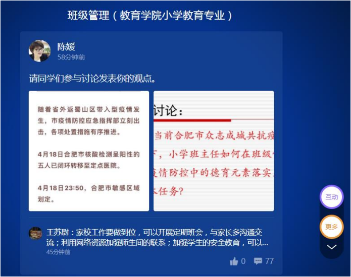 志不求易者成,事不避難者進。“盡管線上教學的難度大于線下教學,但一切困難都是可以克服的。”教育學院的陳媛老師說道。作為教育學院小學教育的專業負責人和專業課的任課教師,陳媛牢固樹立責任意識和使命意識,忠實履行教書育人職責,積極探索疫情期間課程思政在線上教學的實踐路徑。本學期陳媛教授的課程為《班級管理》,在合肥疫情防控和學校抗“疫”過程中,學生們變成了親歷者和參與者,這些身邊事成為陳老師線上教學最有意義的“導入案例”。她從合肥市疫情入手,帶領同學們思考“在當前合肥市眾志成城抗擊疫情的背景下,小學班主任如何在班級管理中,運用疫情防控中的德育元素落實立德樹人根本任務”。話題一經發布,這些未來的“青年教師們”在“云端”課堂里紛紛出謀劃策,一時間掀起了一股討論的熱潮。從“學生”到“老師”,從“遵守者”到“管理者”,角色互換中,同學們深入體會到疫情防控工作的不易,真切感受到抗擊疫情中所表現出的中國力量、中國精神和中國擔當。