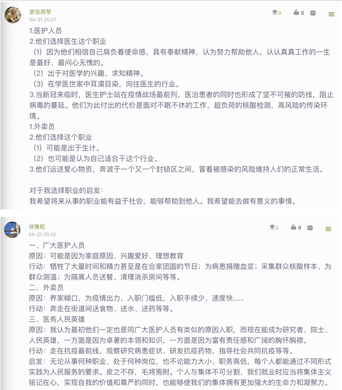 外國語學院的朱俊俏老師從細微處入手,著眼學生關注的話題,在《基礎德語2》課上,基于學生一般都為零基礎,在有限的課時學習中,能用于表達的內容相對偏少,朱老師聯系實事,聚焦疫情下的職業選擇,讓同學們“有話可說”。通過“大白”、外賣小哥的圖片以及“抗疫”、“奮戰”等關鍵詞,朱老師一步步帶領學生了解不同職業的工作內容和職業行為,引導學生了解不同職業的道德要求。課堂上,朱老師對學生職業選擇的理由進行提問,引導學生在今后進行職業選擇時,把個人的未來自覺地融入國家和社會的需要之中。