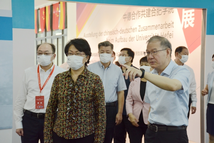 在參觀中德合作共建合肥學院展的過程中,翁鐵慧一行聽取了王其東對我校建校歷史、教育教學改革、國際交流合作、產教融合等情況的相關介紹,翁鐵慧對學校建校以來堅持的“按社會需求設置專業”的做法給予認可,肯定了學校的辦學定位及高層次應用型人才培養取得的成果。