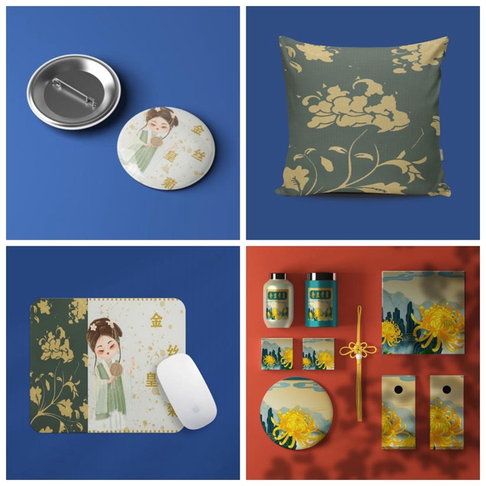 7月15日,經(jīng)過隊員們的共同努力,金絲皇菊的包裝設(shè)計任務基本完成。緊接著,隊員們又開始著手制作金絲皇菊的周邊文創(chuàng)。同學們分工合作,有人繪制文創(chuàng)視覺效果圖,有人制作包裝效果圖,也有人制作文創(chuàng)成品的PPT……眾人拾柴火焰高,在大家的共同努力下,文創(chuàng)產(chǎn)品的設(shè)計取得了明顯成效。