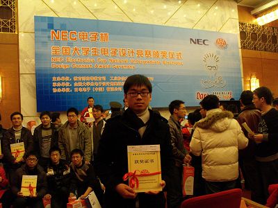 合肥學院榮獲2009年NEC杯全國大學生電子設(shè)計競賽一等獎(張悅龍同學代表我院參賽隊在人民大會堂領(lǐng)獎)