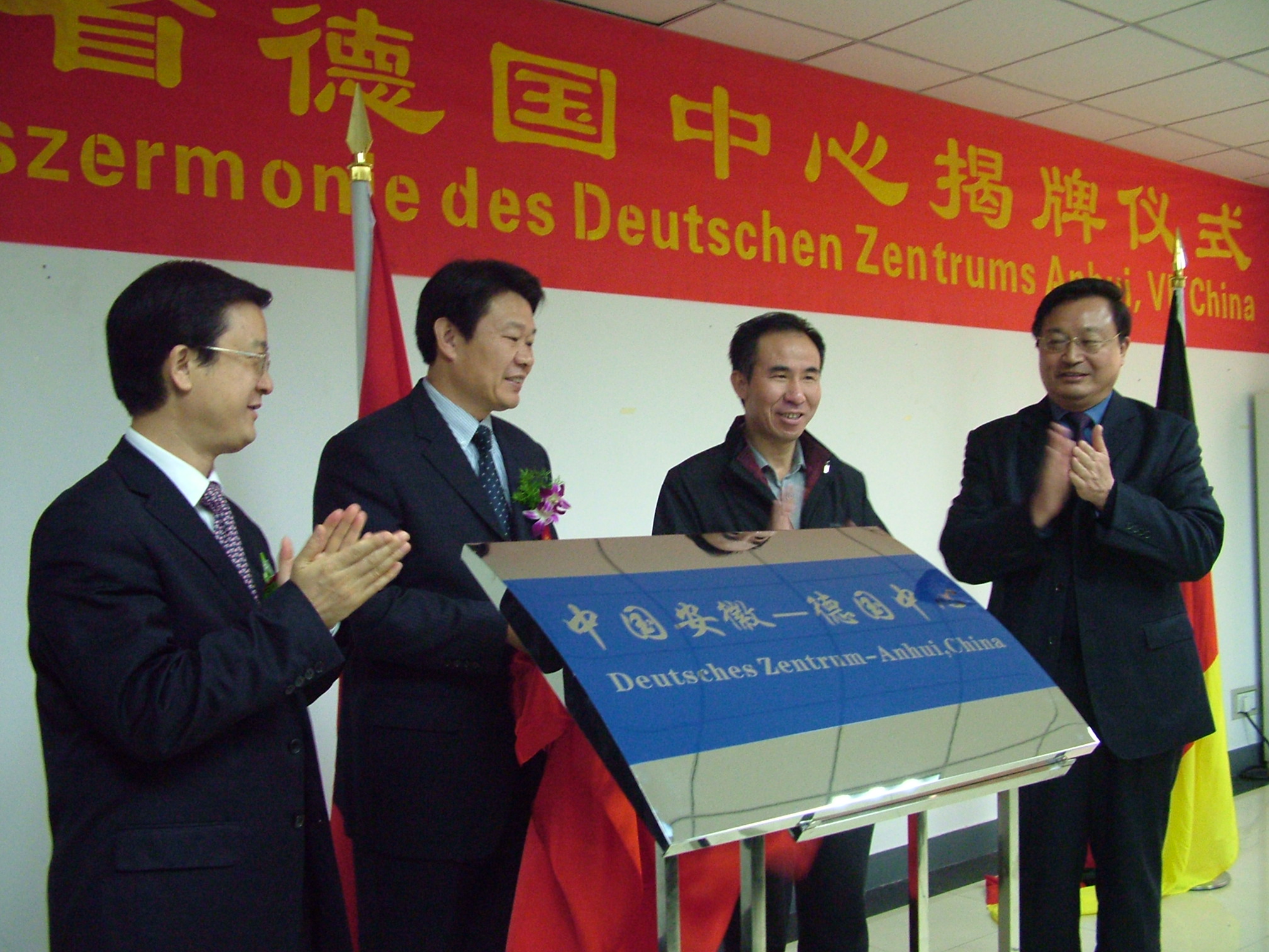 12月18日,“中國安徽―德國中心”在合肥學院成立,省外事辦公室主任李永勝(左二),省教育廳廳長程藝(左三),合肥市委常委、常務副市長張曉嶙(左一),合肥學院黨委書記陶登松為中心揭牌。