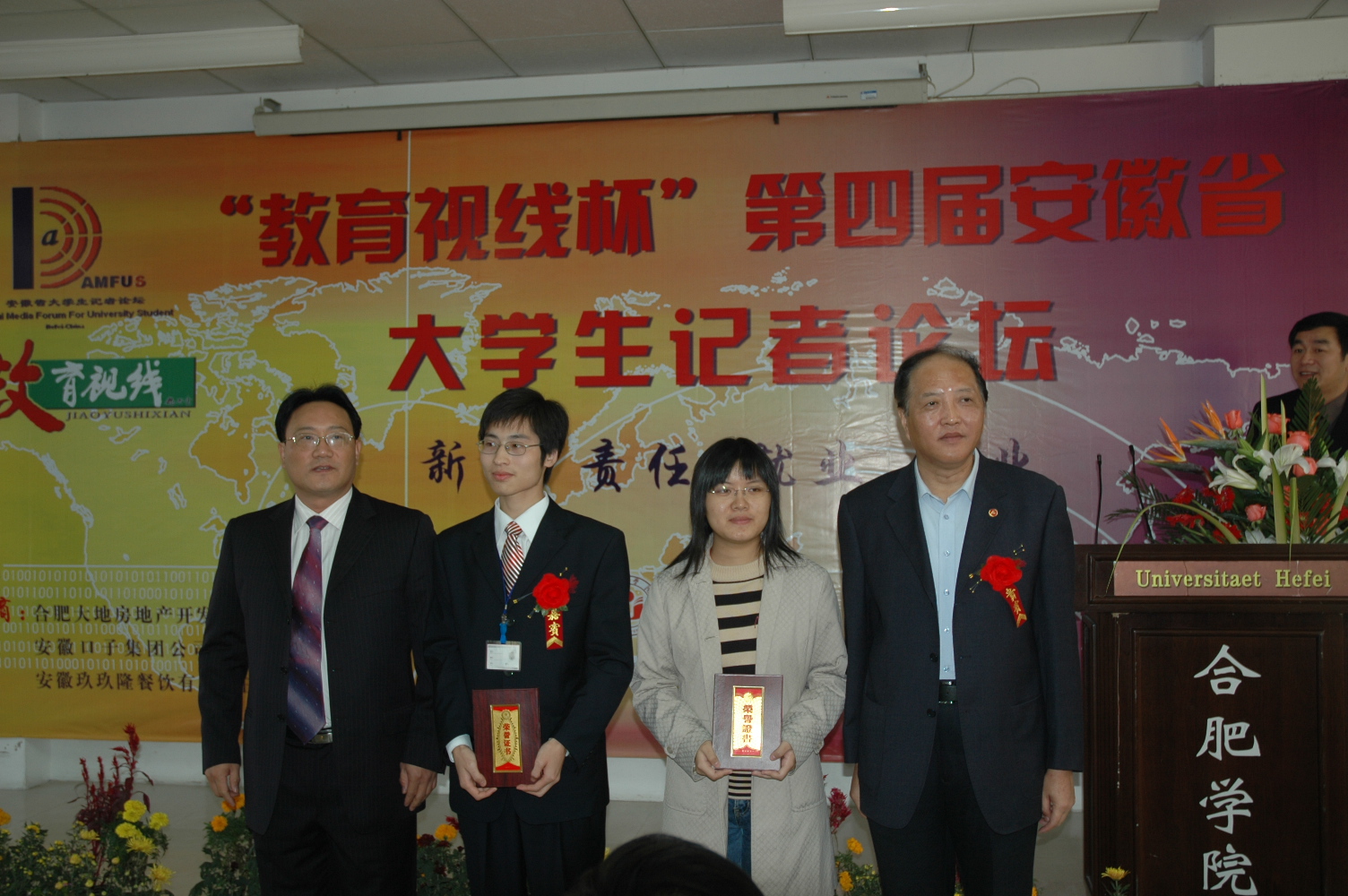 本次“論壇”全程由合肥學院新聞中心的學生記者們自主策劃、組織、實施的。自2004 年來,論壇分別以“探討新形勢下高校‘第二課堂’人才培養模式”、“愛與未來”及“文化與和諧”為主題,至今已成功舉辦3 屆。由于活動日臻成熟與完善,論壇已經形成一個頗具影響力的校園文化品牌。在2007 年全國高校校園文化建設優秀成果評選活動中,安徽省大學生記者論壇以其豐厚先進的文化內涵,務實創新的形式,獨特鮮明的風格,榮獲三等獎,充分展示了我省大學生的社會主人翁精神、自主創造性和思想層次性。