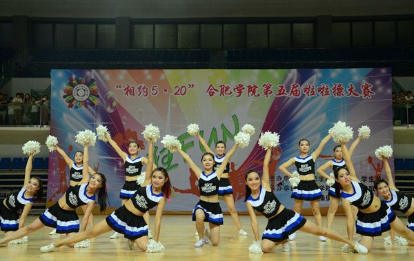 在各隊(duì)伍圓滿完成由三人代表的個(gè)人展示后,由我校各系精英組成的火花啦啦隊(duì)身著藍(lán)白相間、印有“HFUU”標(biāo)志的青春服裝靚麗登場(chǎng),她們的表演拉開了比賽的序幕。在規(guī)定套路中,藝術(shù)系的開場(chǎng)“V”字隊(duì)形就讓觀眾眼前一亮,隨著他們節(jié)奏變化,隊(duì)形也在不斷地改變,藝術(shù)系用靈動(dòng)的身姿和奔放的舞步詮釋著青春的活力與熱情,同時(shí)憑借張揚(yáng)熱烈的表演和整齊劃一的表演引來(lái)全場(chǎng)雷鳴般的掌聲和歡呼聲。“揚(yáng)我雄威,興我建工!”建工系筑魂啦啦隊(duì)迎面走來(lái),他們動(dòng)感的舞步,完美的編排緊緊吸引了觀眾們的眼球。在自選動(dòng)作中,教育系隊(duì)員的造型更是展現(xiàn)了力與美的結(jié)合,他們緊跟著音樂(lè)輕快地旋轉(zhuǎn),跳躍,不斷變換著隊(duì)形,整套動(dòng)作流暢自然,一氣呵成,明快奔放的動(dòng)作顯得干凈利落,帶給觀眾全新的視覺感受。隨后的比賽中,各系代表隊(duì)風(fēng)格迥異,高潮迭起。