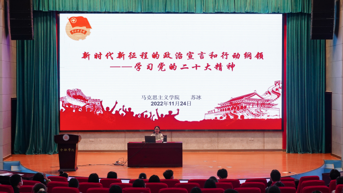 開班儀式后,馬克思主義學院副院長(主持工作)、馬克思主義學院直屬黨支部書記蘇冰作題為《新時代新征程的政治宣言和行動綱領——學習黨的二十大精神》的宣講報告。