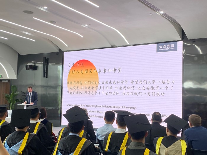 6月16日上午,我校和大眾集團合作培養的首批“種子工程師”順利畢業,校長吳春梅出席大眾安徽舉行的畢業典禮。大眾中國執行副總裁傅勤彥先生、大眾安徽首席執行官葛皖鏑博士、首席制造官施耐德先生、首席技術官呂爾曼博士、首席人力資源官邵劍先生以及校長辦公室、教務處、國際交流合作處、先進制造工程學院、人工智能與大數據學院相關領導和老師共同參加畢業典禮。