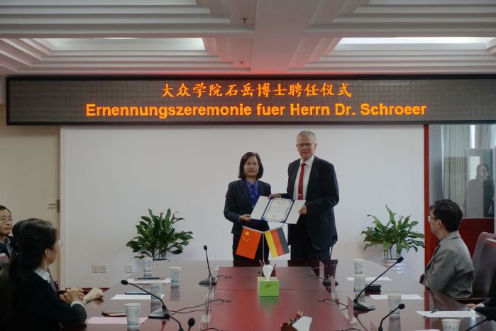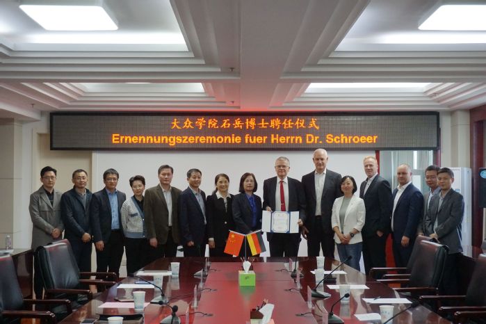 10月8日上午,學(xué)校舉行特聘教授聘任儀式,全職聘請大眾集團前高管、工程師石岳博士(Dr. Klaus Schr?er)為大眾學(xué)院特聘教授。院長吳春梅,組織部部長白義香,教務(wù)處處長、大眾學(xué)院院長王曉峰,人事處處長紀平,國際交流合作處處長張慧,大眾學(xué)院直屬黨支部書記宣躍文,先進制造工程學(xué)院院長胡學(xué)友及相關(guān)教師出席。大眾安徽首席制造官施耐德博士(Harry Schneider),大眾安徽效率管理總監(jiān)朱江萍,大眾安徽維修部總監(jiān)亨德里克·迪普(Hendrik Dippe)受邀出席。儀式由副院長陳秀主持。