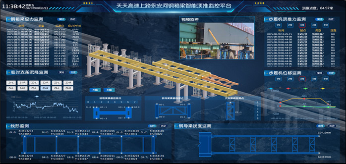 該智能頂推安全監(jiān)控系統(tǒng)平臺(tái)是由合肥大學(xué)完全自主研發(fā)的在線監(jiān)測系統(tǒng),以結(jié)構(gòu)安全和施工過程預(yù)警為導(dǎo)向,深度融合了物聯(lián)網(wǎng)、大數(shù)據(jù)、云/邊緣計(jì)算、人工智能以及數(shù)字孿生等先進(jìn)理念,可廣泛應(yīng)用于橋梁、房屋、隧道、邊坡等結(jié)構(gòu)安全在線監(jiān)測與健康管理。該系統(tǒng)利用云平臺(tái)共享技術(shù),通過預(yù)設(shè)無線傳輸設(shè)備模塊,實(shí)現(xiàn)了監(jiān)測數(shù)據(jù)融合、三維施工模擬、參數(shù)閾值預(yù)警等多項(xiàng)功能。為了應(yīng)對(duì)本次施工安全需求,研究團(tuán)隊(duì)等對(duì)智能監(jiān)控平臺(tái)進(jìn)行了定制化模塊開發(fā),包括鋼箱梁、臨時(shí)支架、鋼導(dǎo)梁、步履機(jī)施工過程參數(shù)及現(xiàn)場視頻信息傳輸?shù)饶K建設(shè)。結(jié)合無線傳輸和實(shí)時(shí)數(shù)據(jù)采集技術(shù),實(shí)現(xiàn)了鋼箱梁頂推過程中主要參數(shù)的實(shí)時(shí)監(jiān)測。經(jīng)過2個(gè)多月的現(xiàn)場實(shí)踐,智能監(jiān)控系統(tǒng)實(shí)時(shí)完整記錄并分析了施工階段各項(xiàng)關(guān)鍵參數(shù),為類似橋梁安全施工提供了可靠的數(shù)字化監(jiān)測平臺(tái)。