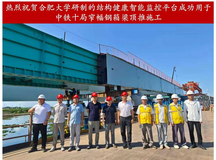 本項(xiàng)目研究得到了上海鐵路局集團(tuán)東華地鐵安徽公司、中鐵十局集團(tuán)四公司和中鐵隧道洛陽監(jiān)理有限公司等單位的大力支持,為我校青年骨干教師提供了豐富的科研資源和實(shí)踐場景,同時(shí)對(duì)研究生培養(yǎng)起到了積極促進(jìn)作用。本次跨度60米窄幅鋼箱梁頂推施工,是合肥大學(xué)結(jié)構(gòu)健康智能監(jiān)控系統(tǒng)平臺(tái)首次成功應(yīng)用于實(shí)際工程項(xiàng)目,也為未來服務(wù)于軌道交通、橋隧及類似復(fù)雜工程施工監(jiān)控提供了堅(jiān)實(shí)的基礎(chǔ)。