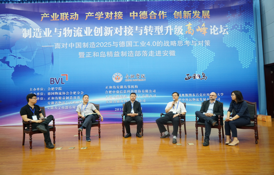 高峰論壇活動(dòng)豐富緊湊,上午組織代表實(shí)地考察參觀了德國馬牌輪胎(合肥)公司、合肥中鼎信息科技股份有限公司、蘇寧電器配送中心、中外運(yùn)合肥物流有限公司4家知名企業(yè);中午參觀了“合肥學(xué)院中德合作30周年成果展”。下午的論壇會(huì)第一階段分別是中國物流采購聯(lián)合會(huì)副會(huì)長(zhǎng)蔡進(jìn)、共生物流平臺(tái)CEO盧立新、正和島副總裁王昆鵬、正和島精益制造部落酋長(zhǎng)王洪艷等4個(gè)主題報(bào)告。隨后,論壇邀請(qǐng)了合肥學(xué)院黨委副書記丁明、德國馬牌輪胎公司總經(jīng)理邁克爾、北京奇步自動(dòng)化控制有限公司董事長(zhǎng)李奇、陜西航天泵閥科技集團(tuán)有限公司董事長(zhǎng)林忠向等展開了“互動(dòng)式對(duì)話”。 對(duì)話緊緊圍繞制造業(yè)與物流業(yè)的對(duì)接與協(xié)同創(chuàng)新、中國制造2025與德國工業(yè)4.0展望與對(duì)策、“互聯(lián)網(wǎng)+”與制造業(yè)的轉(zhuǎn)型升級(jí)、服務(wù)地方產(chǎn)業(yè)發(fā)展、加強(qiáng)產(chǎn)學(xué)對(duì)接等主題,開展了深入的研討交流。