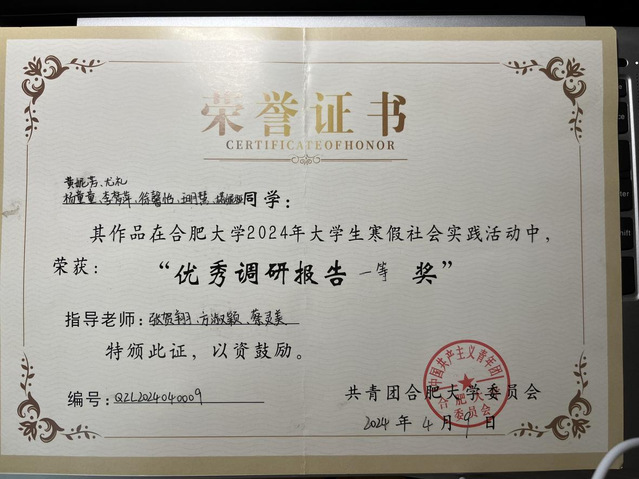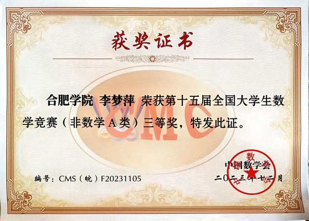 在校期間,李夢萍同學學習成績名列前茅,2022-2023學年學分績點與綜合素質均位列班級第一。曾先后獲“三好學生”、盧文慶獎學金、國家獎學金、國家勵志獎學金、校特等獎學金、校一等獎學金等榮譽。學習之余,她積極參加學科競賽與文體活動,曾獲2024年安徽省大學生國際貿易綜合技能大賽省一等獎、2024年安徽省大學生創新大賽省銅獎、2023年大學生數學競賽省三等獎等。課余時間,她也積極投身于搭建合肥大學留學生服務平臺、暑期“三下鄉”、寒假社會實踐活動等。