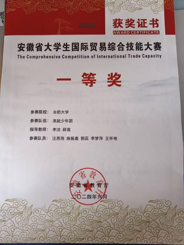 “千萬擊還堅勁,任爾東西南北風。”李夢萍深明大學時光蘊含的無限可能,為磨礪自我,她踴躍投身學科競賽。其中令她銘記于心的經歷,便是大二期間,她滿懷著對國際貿易領域的憧憬與好奇,毅然決然報名參加了安徽省大學生國際貿易大賽。在備賽的日子里,她與團隊成員們日夜不輟,查閱海量資料,深入了解國際貿易大賽與規則,精心策劃方案,反復演練表演技巧。比賽當日,面對眾多有備而來的對手,經過多輪激烈角逐,最終團隊成功斬獲省一等獎的殊榮。