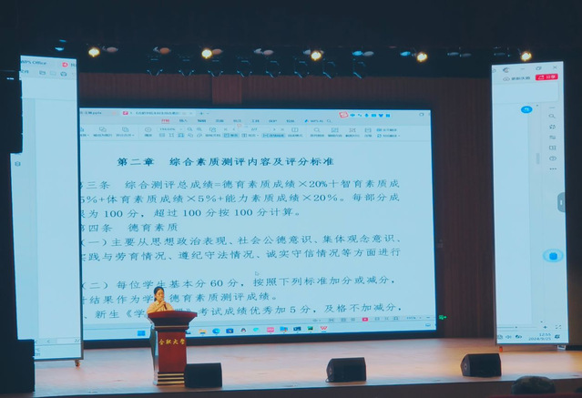 張銀雙老師特別強調了參加各類競賽的重要性,指出這不僅是為了綜測加分,更是學生提升個人能力、積累寶貴經驗的良好平臺。而減分細則中主要有曠課,考試作弊等一些大學生不應該做的不文明不道德行為,并告誡全體新生應嚴格遵守紀律,維護良好的校園風氣。