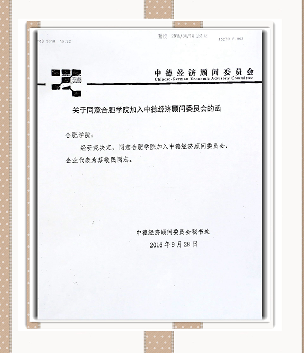 2016年9月28日,商務(wù)部中德經(jīng)濟(jì)顧問委員會(huì)復(fù)函合肥學(xué)院,正式批準(zhǔn)同意合肥學(xué)院加入中德經(jīng)濟(jì)顧問委員會(huì),代表為學(xué)校黨委書記蔡敬民同志。合肥學(xué)院成為第一個(gè)加入中德經(jīng)濟(jì)顧問委員會(huì)的高校代表。并將于10月下旬參加在北京舉行的中德(安徽)產(chǎn)業(yè)合作圓桌會(huì)議。