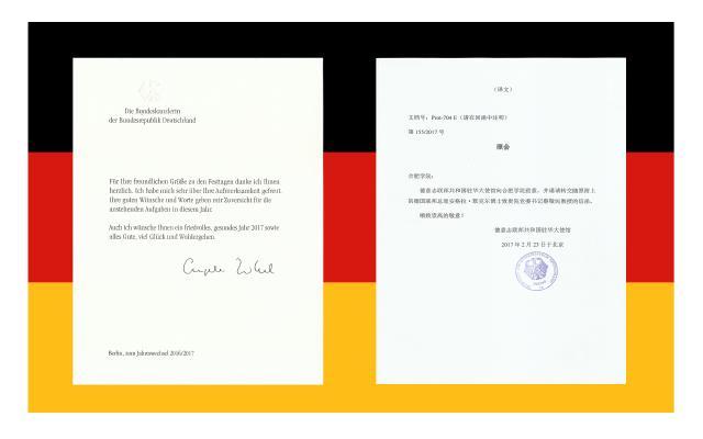 Der Senatspr?sident der Universit?t Hefei, Prof. Dr. Cai Jingmin, empfing kürzlich ein von Bundeskanzlerin Angela Merkel eigenh?ndig verfasstes Schreiben, in dem sie ihre Neujahrswünsche an Herrn Senatspr?sidenten Prof. Dr. Cai Jingmin sowie an die Universit?t Hefei ?u?erte. Damit ist es das dritte eigenh?ndig verfasste Schreiben, das die Universit?t Hefei bisher von Bundeskanzlerin erhielt.