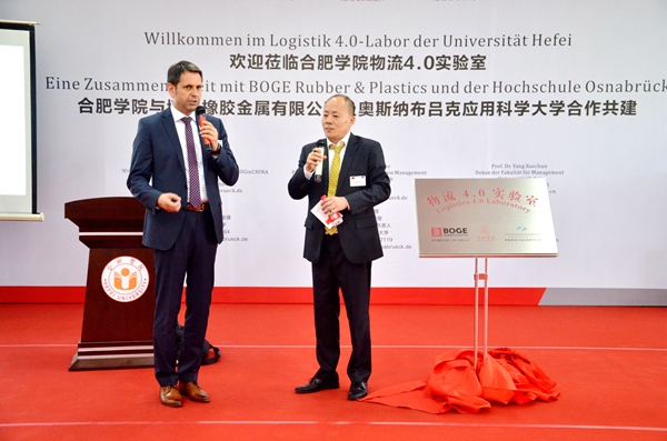 在由合肥學院、德國奧斯納布呂克應用科學大學及德國BOGE公司合作共建的物流4.0”實驗室揭牌儀式上,合肥學院黨委書記蔡敬民致辭,對德國下薩克森州經濟代表團的到來表示由衷的歡迎。蔡敬民回憶了我校與德國奧斯納布呂克應用科學大學的合作歷史,兩校30余年來在師生交流、科研合作、骨干教師培養、國際會議合作等領域開展有全方位的合作。兩校共同申報的中德合作物流管理本科專業更是成為教育部批準的安徽省首個中外合作辦學項目。此次中德合作物流4.0”實驗室的建立,旨在進一步拓展校企合作領域,增強學生專業實踐能力。他表示,合肥學院愿意繼續為中德高校及企業間的合作不斷發揮優勢。德國BOGE(中國)公司代表王爾明對公司研究領域以及產能運營狀況做了簡單介紹。他提到,公司對 BOGE “工業4.0”現代化企業物流體系與中德合作物流4.0”實驗室之間的合作充滿期待,并邀請到場嘉賓訪問BOGE公司歡迎合肥學院學生赴BOGE公司就業。該實驗室學術主任格斯寧博士就實驗室具體情況、學生參與物流工具設計與控制的方式以及該實驗室基礎上課程與實踐的深度融合等內容做了深入介紹。隨后,在場中德嘉賓共同為中德合作物流4.0”實驗室揭牌。