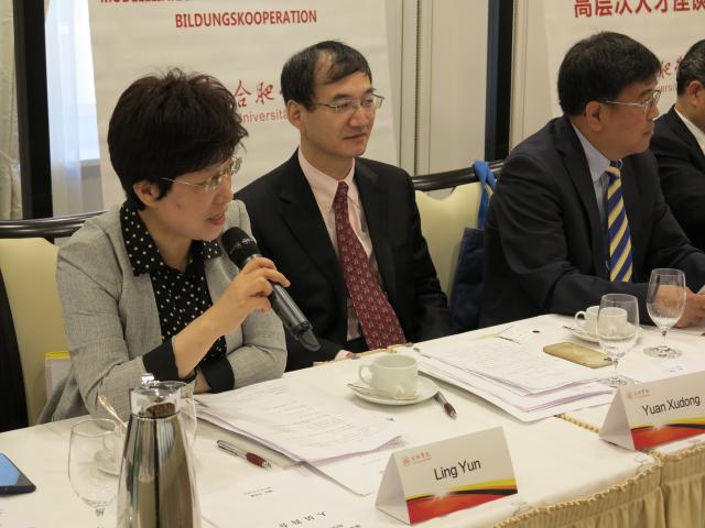 合肥學(xué)院黨委書記蔡敬民首先致辭。他向李錦斌書記一直高度重視中德教育合作示范基地建設(shè)以及人才工作表示感謝!向長(zhǎng)期以來,一直支持學(xué)校建設(shè)與發(fā)展的德國(guó)教育界和企業(yè)界的專家、教授表示感謝!并對(duì)正在加速推進(jìn)中德教育合作示范基地建設(shè)的相關(guān)工作進(jìn)行了簡(jiǎn)要介紹。