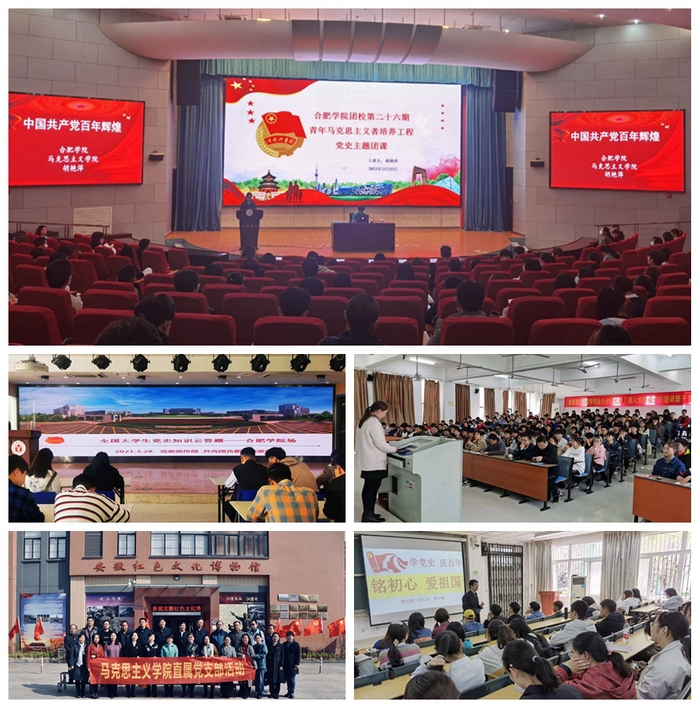 “自選動(dòng)作”有特色。各單位紛紛召開(kāi)黨史學(xué)習(xí)教育動(dòng)員部署大會(huì),班子成員帶頭為所在黨支部講專題黨課,發(fā)揮示范領(lǐng)學(xué)作用。上線黨史學(xué)習(xí)教育專欄,通過(guò)學(xué)校網(wǎng)站、簡(jiǎn)報(bào)、校報(bào)、微信公眾號(hào)等媒體矩陣推進(jìn)黨史學(xué)習(xí)教育全方位、立體化宣傳,聚力營(yíng)造黨史學(xué)習(xí)教育濃厚氛圍。研究組建黨史宣講團(tuán)工作,研討宣講選題、課件、講稿等,精心謀劃“百年黨史、紅色永存”宣講活動(dòng)。發(fā)揮“安徽省中國(guó)特色社會(huì)主義理論體系研究中心合肥學(xué)院基地”和“合肥黨史研究基地”理論研究?jī)?yōu)勢(shì),組織教師深入開(kāi)展黨史研究。推出“四史”專題資源服務(wù),設(shè)立“四史”學(xué)習(xí)教育專題展示書(shū)架,共展出《中共黨史》《中國(guó)改革開(kāi)放》《社會(huì)主義思想史》等約1800多冊(cè)著作。以弘揚(yáng)社會(huì)主義核心價(jià)值觀為主線,以講好中國(guó)共產(chǎn)黨的故事、講好中國(guó)故事、講好“兩個(gè)一百年”的故事為切入點(diǎn),舉行慶祝建黨100周年讀“四史”征文等活動(dòng)。舉辦“中國(guó)共產(chǎn)黨百年輝煌”主題報(bào)告會(huì),組織學(xué)生參加全國(guó)大學(xué)生黨史知識(shí)競(jìng)答云答題,開(kāi)展“青春心向黨 建功新時(shí)代”演講比賽,帶領(lǐng)學(xué)生重走中國(guó)共產(chǎn)黨轟轟烈烈的百年征程。