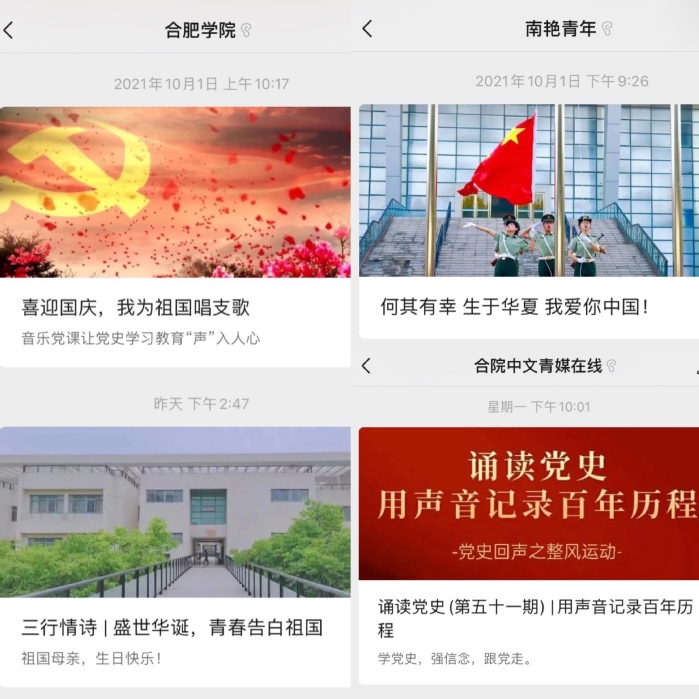 如果信念有顏色,那一定是中國紅。10月1日,迎著清晨第一縷陽光,合肥學院舉行慶祝中華人民共和國成立72周年升旗儀式。校國旗隊隊員邁著矯健的步伐,莊重地走向升旗臺。合院學子在國歌聲中,看五星紅旗冉冉升起,內心燃起無言的感動。為豐富國慶長假黨史學習教育資源,營造“處處能學、時時可學”的學習環境和濃厚氛圍,校園媒體矩陣聯動發力,為學生學習黨史提供豐富的紅色“養料”。黨委宣傳部、團委、語言文化與傳媒學院等各級微信公眾號分別推出線上音樂黨課、給祖國的三行情詩、國慶觀影指南、黨史回聲等特輯,通過創新學習載體和內容,引發情的共鳴、理的認同、精神上的震動,讓黨的理論、黨的初心扎根到青年學子心里。