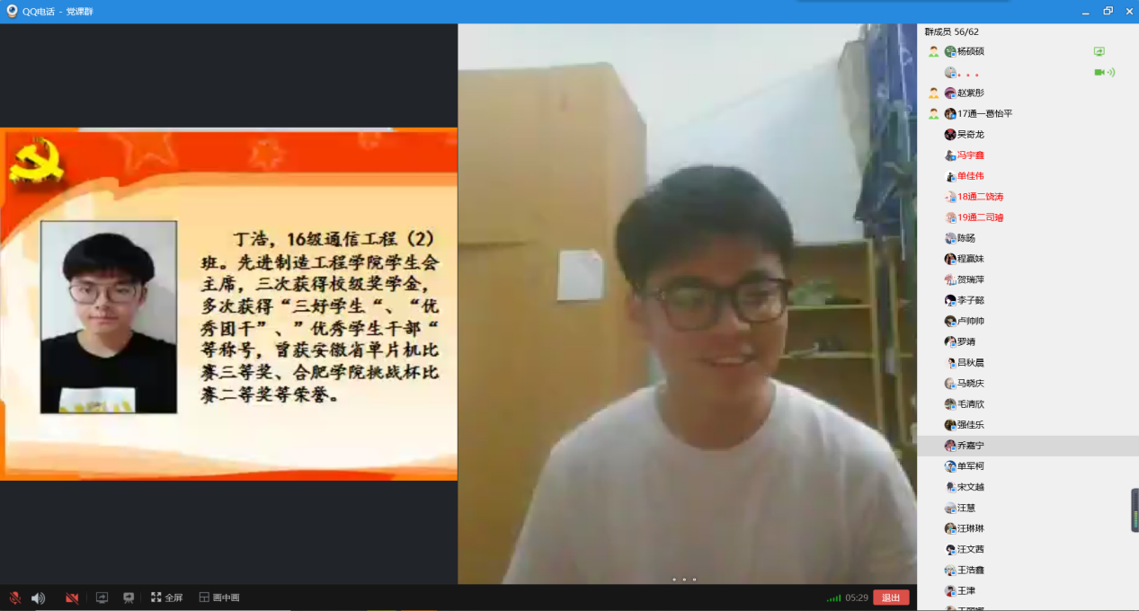先進制造工程學院通信工程學生黨支部六月份第二次黨課于2020年6月17日晚6點以QQ會議形式展開。通信工程學生黨支部支部黨員及積極分子參會,共61人。本次黨課主要由大四黨員丁浩同志對在就業、考研、創業等問題上如何抉擇給支部同志們分享自己的看法和態度并提出成熟性的意見建議。