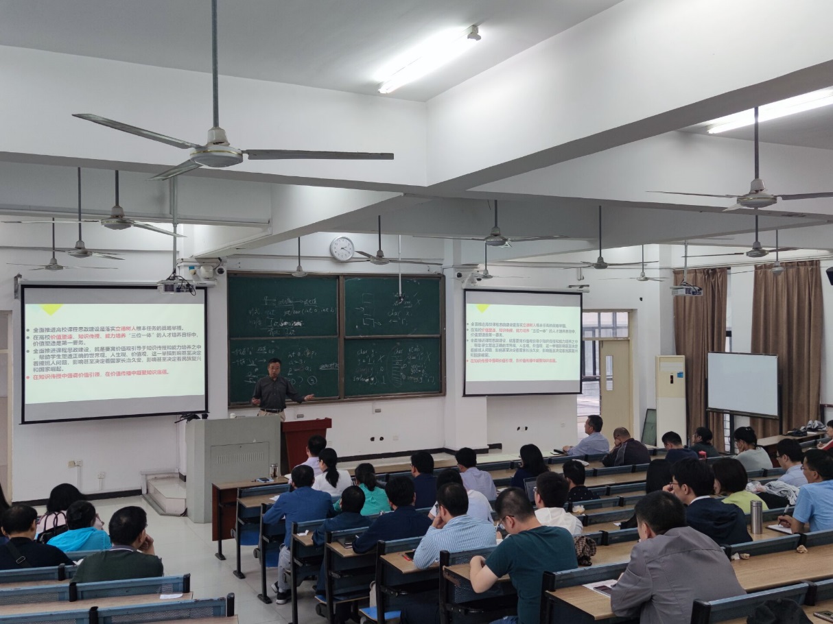 姜叢山老師結合長期從事學校思想政治工作與德育研究工作的豐富經驗,對本校思政工作如何正確定位,如何樹立科學的工作理念,課程思政怎樣與實際工作相結合等談了他獨到的見解。他先是從習總書記在學校思想政治理論課教師座談會上的講話說起,概述了課程思政的緣起,并詳細闡述了課程思政的意義。隨后又進一步介紹了全面推進高校課程思政建設的工作目標,即立足于解決培養什么人、怎樣培養人、為誰培養人這一根本問題,全面推進全國所有高校、所有學科專業的課程思政。最后,姜叢山老師還詳細的介紹了全面推進課程思政的具體要求和內容。