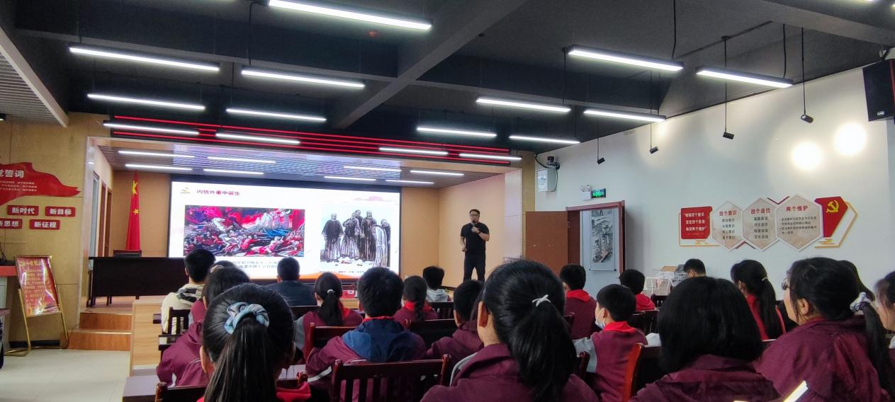 活動伊始,由主持介紹此次活動的主題,然后由宋超書記正式進行中國共產黨的黨史授課。介紹跨度從中國共產黨誕生的背景到長征時的隱蔽戰線直到遵義會議徹底扭轉了中國共產黨的歷史命運。宋超書記主要從四個方面進行了講解,一:改革派與保守派的辯證思想;二:“筆桿子”和“槍桿子”;三:“隱形守護者”;四:決定中國共產黨命運的會議。宋書記的演講精彩絕倫,通俗易懂,符合小學生和中學生的思維方式和接受能力。學生們也聽的津津有味,時不時的跟宋書記進行互動,回答問題。最后,宋書記選了一位回答最好的同學送了一本《紅巖》,希望他能繼續學習黨史,好好學習文化知識,將來為祖國的發展出一份力。通過此次黨課,進一步增強了在場人員的愛黨、愛國之情,恪守興黨之責,同時也極大程度的引導并激發了學生對黨史的了解和愛國熱情。