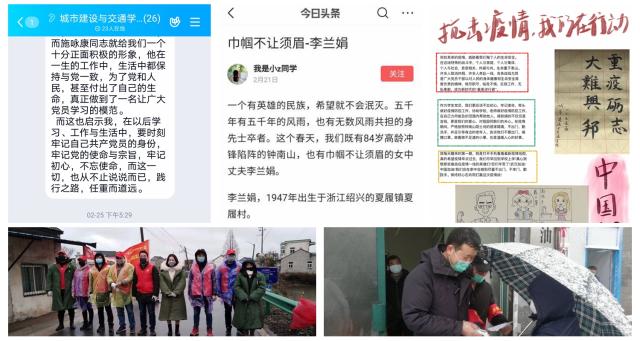 防疫工作開展一個月來,涌現了一批抗“疫”先進人物。學院選派泗縣惠廟村駐村干部劉鵬飛推遲婚禮,堅守一線防控,學習強國予以報道;三名黨員教師克服自身困難,在下沉社區防控一線工作崗位上盡職盡責,得到好評,其中合肥電視臺對朱江老師進行了采訪報道。谷艷紅等數名黨員教師在老家小區積極參加當地社區防疫志愿活動。學生黨員李陳苗、李新安等同學主動聯系家庭所在地黨組織,承擔起疫情防控志愿者的工作。