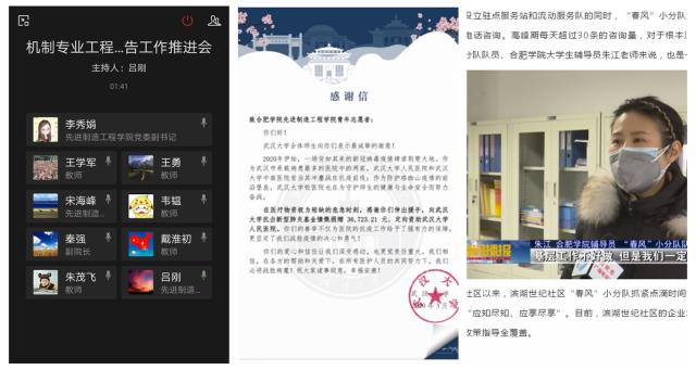 在疫情防控中,學院黨員領導干部靠前指揮,全體黨政干部堅守崗位,每日隨訪學生情況,并加強宣傳引導,堅定師生打贏疫情防控阻擊戰的信心決心。對湖北地區和與湖北有過接觸的學生,由院領導、輔導員一對一重點聯系,及時掌握情況,及時指導幫助。在抓好疫情防控工作的同時,充分運用QQ群、微信群等信息化工具,召開線上會議,對各項工作進行了具體部署:包括開學后疫情防控、黨建、線上教學、產學研、教科研、碩士點申報、研究生招生、人才引進、學生等各項工作,保證了“停開學不停工作”,促進了各項工作的穩步推進。
