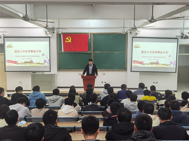 先進制造工程學院機制學生黨支部于2021年10月23日晚6點30分在38棟3階梯教室開展退伍士兵優(yōu)秀事跡分享活動,支部全體成員均參與了本次活動。本次活動是由18級機制一班預備黨員趙飛洋同學和18級機制二班發(fā)展對象宣興波同學分享自己部隊生活中的親身經歷和優(yōu)秀事跡。并且就大學生是否積極入伍,以及入伍會給自己的發(fā)展帶來怎樣的影響等問題上給支部同學們分享自己的看法和見解。