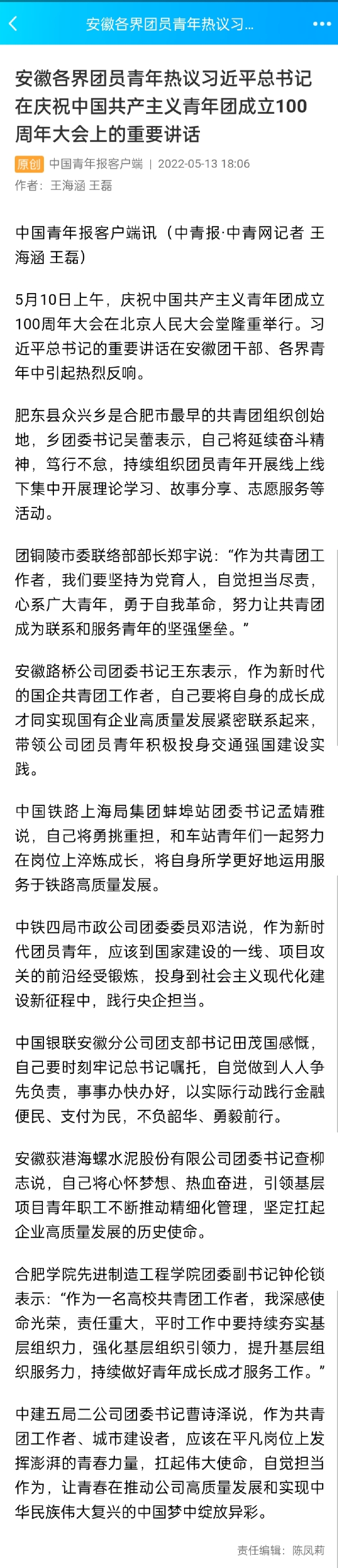 安徽路橋公司團委書記王東表示,作為新時代的國企共青團工作者,自己要將自身的成長成才同實現國有企業高質量發展緊密聯系起來,帶領公司團員青年積極投身交通強國建設實踐。