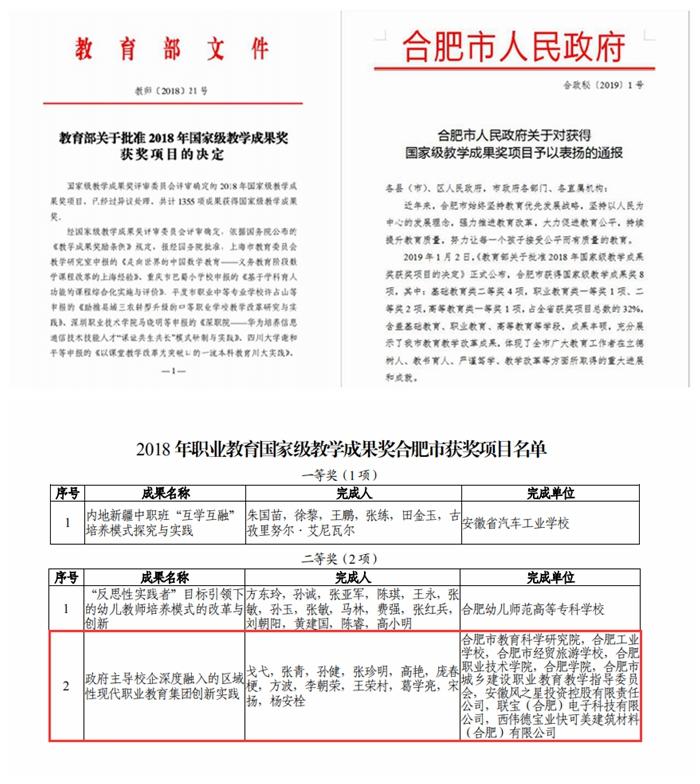 “報(bào)告寫得很好,可以送閱材料形式,印發(fā)至相關(guān)部門及學(xué)校?!边@是合肥市市委副書記、市長凌云同志在審閱《關(guān)于合肥市職業(yè)院校教師2017年首批赴德高端研修情況的報(bào)告》后簽署的意見。教育部黨組書記、部長陳寶生在合肥學(xué)院視察、調(diào)研期間,市領(lǐng)導(dǎo)介紹了職業(yè)院校教師赴德研修情況,并對合肥學(xué)院的大力支持表示了感謝。2018年,我校聯(lián)合申報(bào)的《政府主導(dǎo)校企深度融入?yún)^(qū)域性現(xiàn)代職業(yè)教育集團(tuán)創(chuàng)新實(shí)踐》項(xiàng)目榮獲中等職業(yè)教育教學(xué)成果獎國家二等獎、安徽省特等獎,《合肥市人民政府關(guān)于對獲得國家級教學(xué)成果獎項(xiàng)目予以表揚(yáng)的通報(bào)》(合政秘〔2019〕1號)中對相關(guān)單位和個人進(jìn)行了通報(bào)表揚(yáng)。合肥學(xué)院合肥職業(yè)院校教師能力發(fā)展中心成立4年來,在服務(wù)地方職業(yè)教育發(fā)展方面取得了顯著成果。