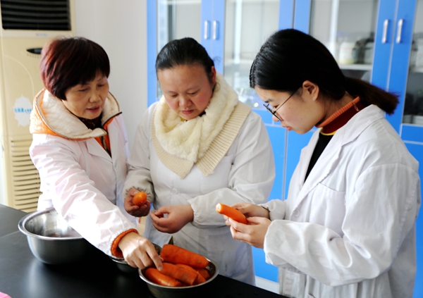 采訪過程中,在面積不大的實驗室中,由王中鳳科技攻關項目聘用的科研助手饒銀環正在專心地制作蔬果蛋醬。2014級食品科學與工程專業的學生陳巴麗正做她的畢業論文實驗(探究蛋清熱凝固性及抗熱凝方法),她熟練地操作著試驗臺上的瓶瓶罐罐。陳巴麗在她自己的實驗空隙還幫著饒銀環處理蔬果。陳巴麗告訴我們,王老師常常會給那些未來想要從事科學研究的學生提出務實建議,“她要求我們求真務實、腳踏實地;要耐得住寂寞,守得住清貧,經得起失敗;需要靜得下心去學習,去實驗,去思考。”她還告訴我們,“王老師是一位個性耿直的可愛老師,她的課上得也很生動性,非常受歡迎,能讓讓枯燥的理論知識與生產實際和現實生活相融相冾。”王中鳳說,“我基本上采用互動式的課堂教學,通過互動調動和激發學生的思維與興趣,活躍課堂氣氛。”