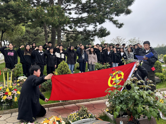 師生們集體鞠躬默哀,依次敬獻鮮花,寄托追憶與不舍。在重溫入團誓詞儀式上,學員們面向團旗莊嚴宣誓,擲地有聲的誓詞不僅是青年團員們對作為一名合格的共青團員承諾的重申,更是表達了傳承和發揚朱世群老師無私奉獻精神的決心。