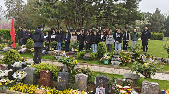 緬懷英雄先烈,傳承奉獻精神。清明節到來之際,校團委、學生處帶領青馬班學員前往大蜀山文化陵園深切悼念我校優秀扶貧干部朱世群同志。在朱世群同志的墓碑前,青馬班學員被朱老師的先進事跡深深感動,學員孫靜濤說:“朱老師是我們身邊的英雄,是我們學習的榜樣,他用生命書寫忠誠、用奉獻詮釋追求、用行動踐行誓言,詮釋了新時代共產黨員的初心和使命,他的精神將永遠激勵著我們前行?!睅熒w鞠躬默哀,依次敬獻鮮花,寄托追憶與不舍。
