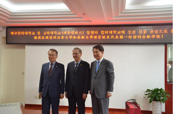 On May 16th, HFU President,Mr. Wang Qidong, meets the delegation from Cheju Halla University (CHU) and Korea University (Sejong Campus, KU-SC), led by Mr.Kim Sung-Hun, President of CHU, and Mr. An Cheung-O, Vice President of KU-SC.