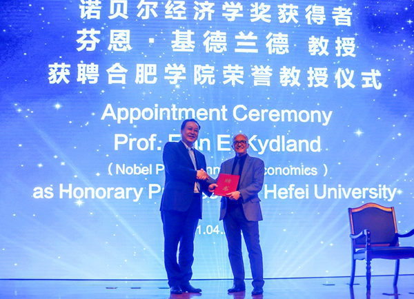 Dr. Cai Jingmin, Chair of HFU Council, and Dr. Wang Qidong,president of HFU entitled him HFU Honorary Professor. Professor Kydland says the distinctive characteristics and development potential of HFU impresses him much and he expects to cooperate with HFU in the future.