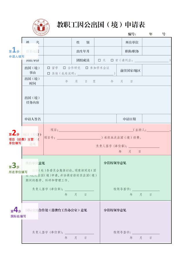 2. 申請人提交本次出國(境)事項(xiàng)至所在學(xué)院/部門研究,由所在單位負(fù)責(zé)人簽署審批意見(單位主要負(fù)責(zé)人出訪須報(bào)本單位分管校領(lǐng)導(dǎo)審批);
