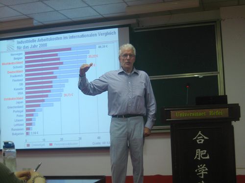 奚偉德圍繞著德國的經(jīng)濟模式、經(jīng)濟框架以及中德不同的管理模式躊文化管理展開了精彩的演講。他指出:德國的經(jīng)濟受國家控制、官僚體制、勞動力成本、社會負擔(dān)、稅費、國家負債等許多因素的影響,因而經(jīng)濟情況非常復(fù)雜。在談到德國經(jīng)濟的模式和框架時,他認為,德國實行的是一種將市場自由化和社會責(zé)任結(jié)合在一起的社會市場經(jīng)濟制度,注重經(jīng)濟和社會的安全、私人產(chǎn)權(quán)保護、技術(shù)進步、正確的競爭導(dǎo)向等一系列問題。隨后,在談管理時他表示,管理是建立在一定的文化基礎(chǔ)上的,在不同的環(huán)境和文化(即所謂的價值觀)背景下,圍繞組織目標計劃、實施和控制的過程。不同的歷史和文化背景會產(chǎn)生不同的管理模式。德國是團隊式管理,其核心和原則是管理者與被管理者共同商定并完成企業(yè)目標;而中國受儒家思想影響,家長式管理則成為典型的中國傳統(tǒng)管理模式。奚偉德教授接著說,建立在兩種不同文化基礎(chǔ)上的管理模式各有利弊,希望中德可以加強交流與合作,促使雙方共同進步。最后,報告會在一片熱烈的掌聲中落下了帷幕。