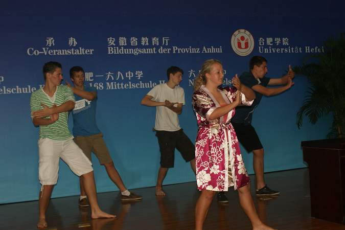 德國學生代表發表學習感言 耿處長向德國學生頒發國家漢辦授予的漢語證書 中德學生共同表演的《花香墨舞》 夏令營三班同學表演中國太極拳