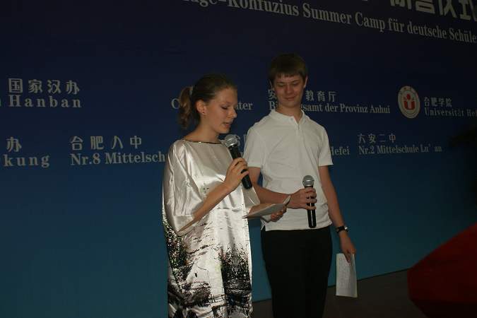 2011年8月15日上午,“漢語橋-德國中學生夏令營”閉營儀式在我院南艷湖校區隆重舉行。安徽省教育廳外事處處長耿尊芳,漢諾威孔子學院院長胡春春,我院外事處處長吳克、副處長賈峰以及協辦單位一六八中學、合肥八中、六安二中師生代表約三百人參加了儀式。